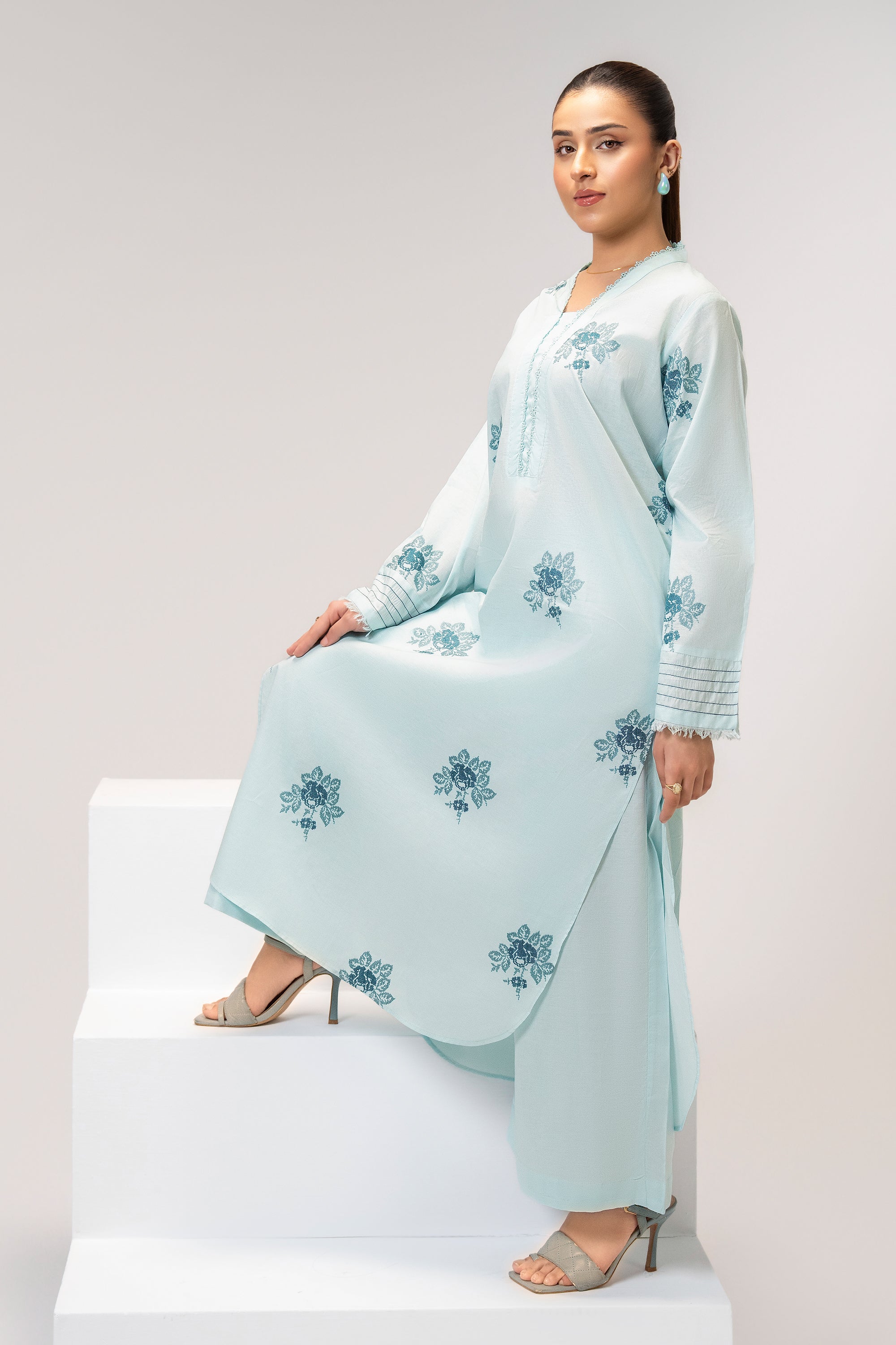 Step into elegance with this aqua lawn ensemble, featuring delicate cross-stitch embroidery that adds a touch of refined artistry. The matching flared trouser lends a graceful, traditional flair, enhancing the ensemble’s timeless appeal. With its cool tones and intricate craftsmanship, this outfit is perfect for daytime occasions and festive summer moments—a classic fusion of subtle charm and Eastern sophistication.