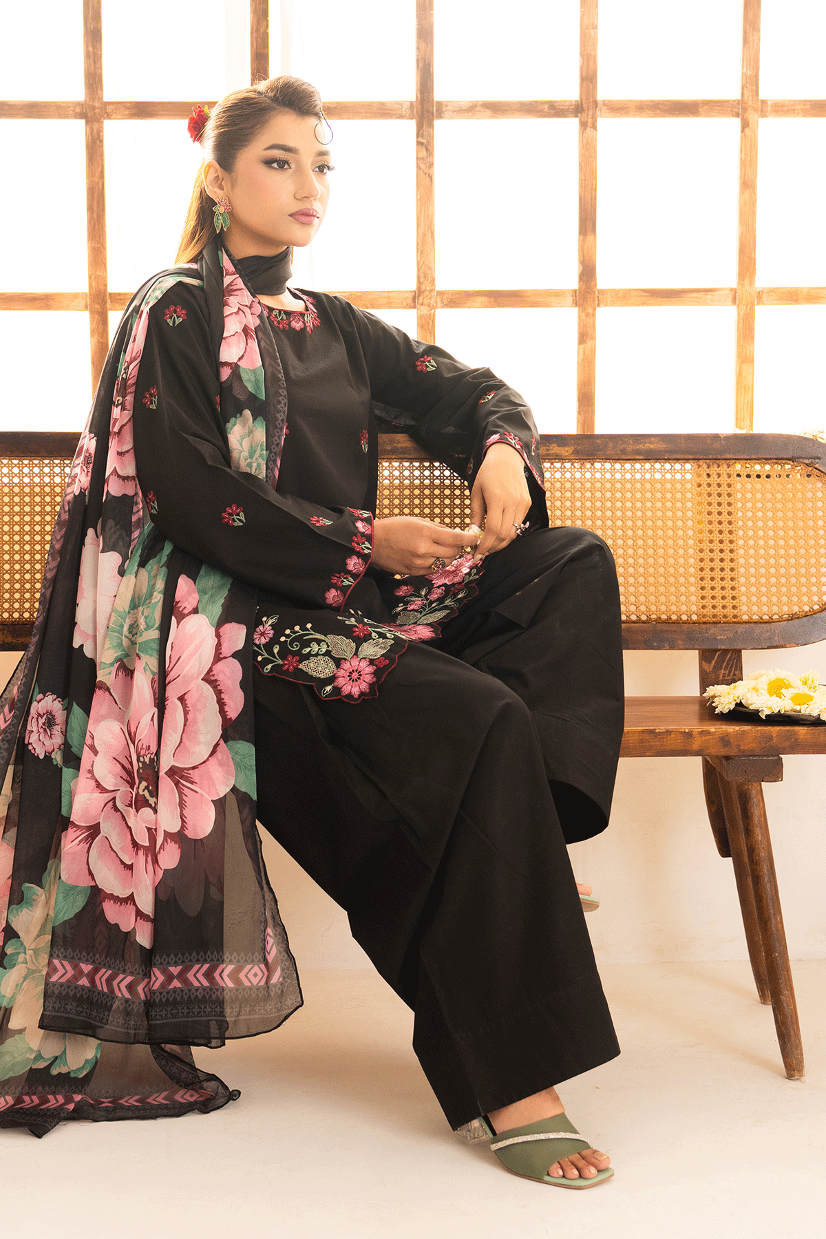Black embroidered short shirt paired with a farshi shalwar and silk printed duppatta, crafted in lawn. Delicate detailing on a soft black base creates a graceful festive look. Perfect for Eid and Ramadan celebrations, blending comfort with timeless elegance.